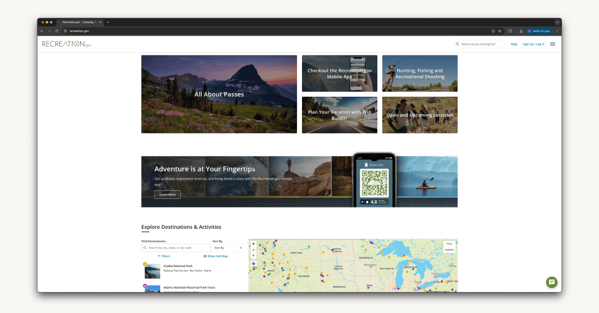 Think of it like Booking.com for nature — a place where you can reserve campgrounds, buy national park passes, enter lotteries for hiking permits, or find guided tours. It connects users to over 5,800 sites managed by 14 federal agencies.
