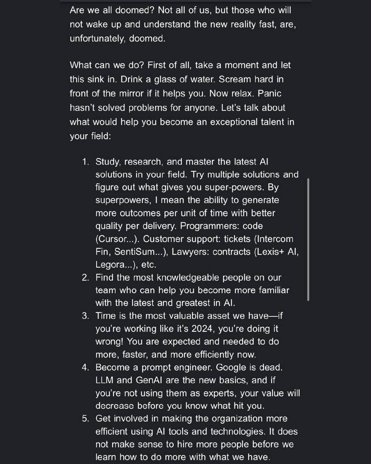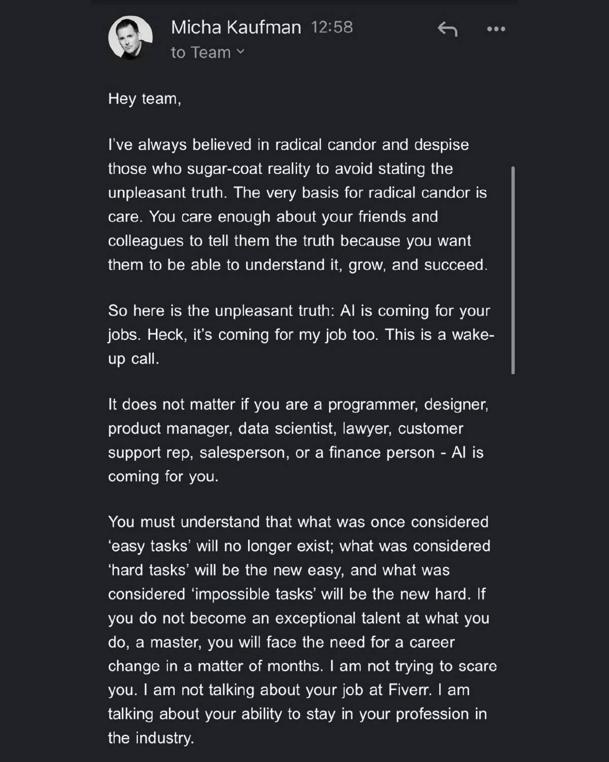 I came across a message that Fiverr’s CEO, Micha Kaufman, sent to his team about AI.